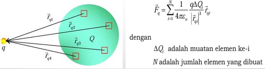 - Dengan demikian, benda besar yang bermuatan Q tersebut dapat dipandang sebagai susunan titik-titik (elemen-elemen kecil). Tiap titik melakukan gaya dengan muatan q.