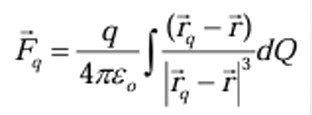 - Karena volume elemen menuju nol, maka jumlah elemen menuju tak berhingga, atau N -> ∞. Bentuk penjumlahan dengan N ->∞ . Ini merupakan definisi dari integral seperti yang dipelajari di mata kuliah matematika dasar. Jadi, bentuk integral dari gaya yang dialami muatan q menjadi: