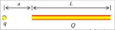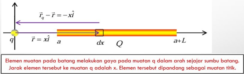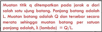 - Kita tinjau kasus muatan q ditempatkan pada sumbu batang dan pada jarak a dari ujung terdekat batang seperti pada gambar berikut.