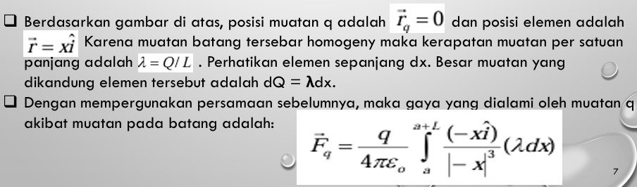 - Pertama kita akan bahas gaya pada muatan titik q oleh batang yang bermuatan Q dan memiliki panjang L di mana muatan q berada di sumbu batang.