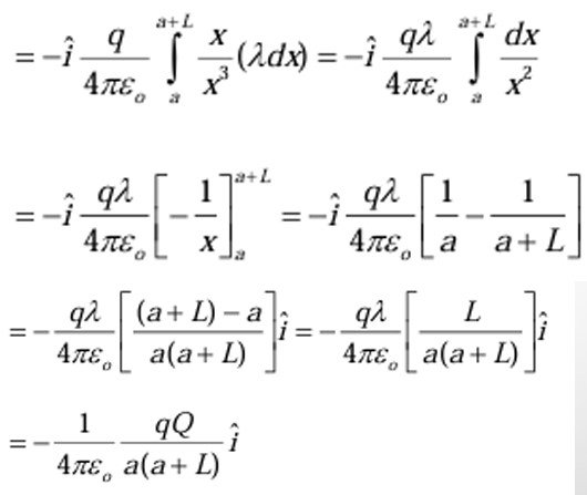 - Karena muatan q berada pada sumbu batang maka pastikan arah gaya pada muatan tersebut sejajar dengan sumbu batang. Tiap elemen pada batang melakukan gaya yang arahnya sama pada muatan q sehingga kita bisa membahas persoalan secara scalar. Kita ambil sumbu batang berada pada sumbu-x seperti pada berikut:
